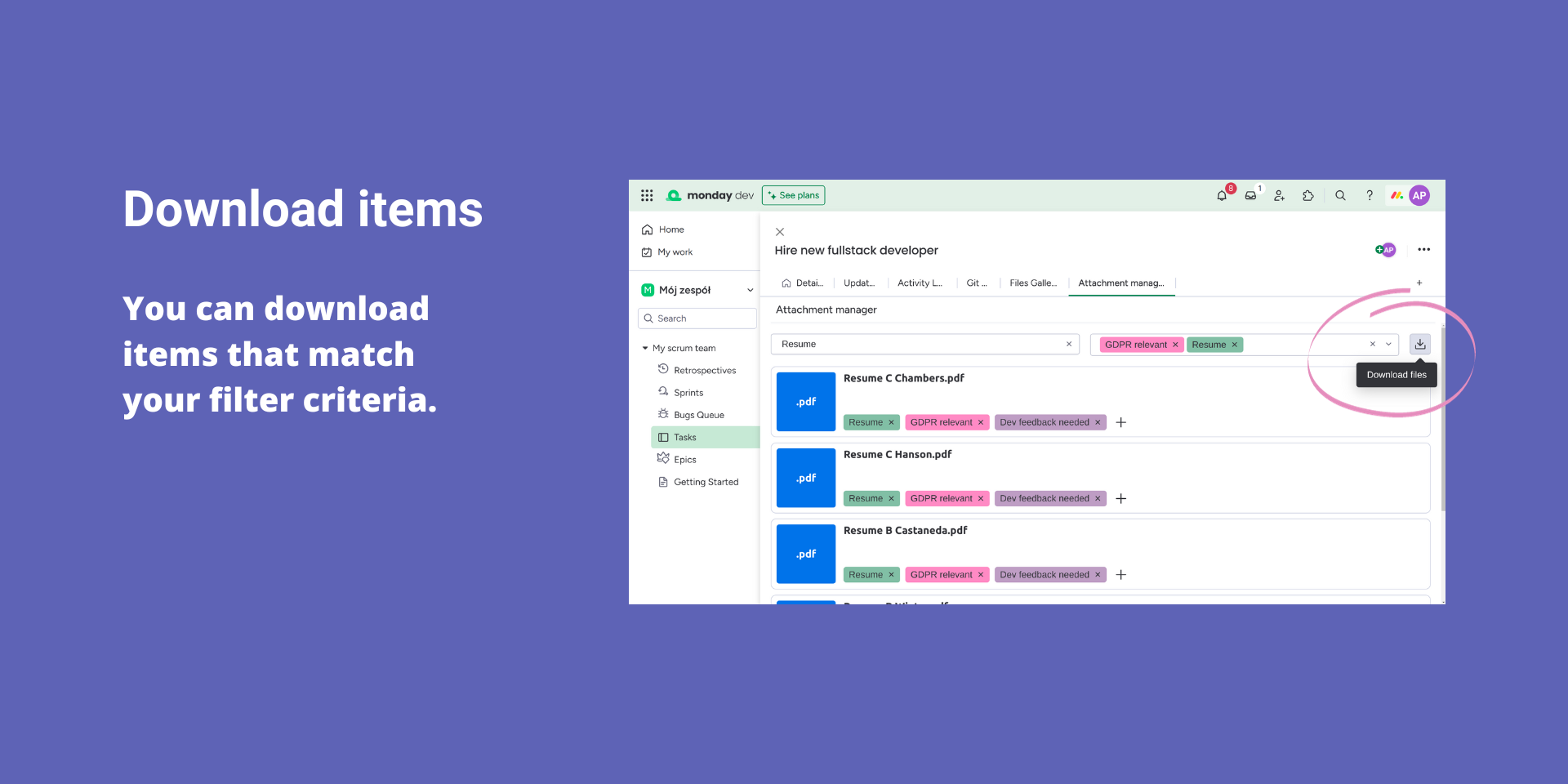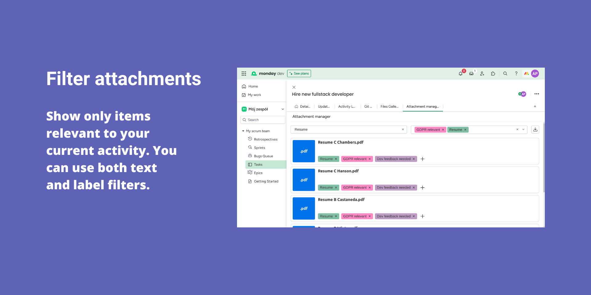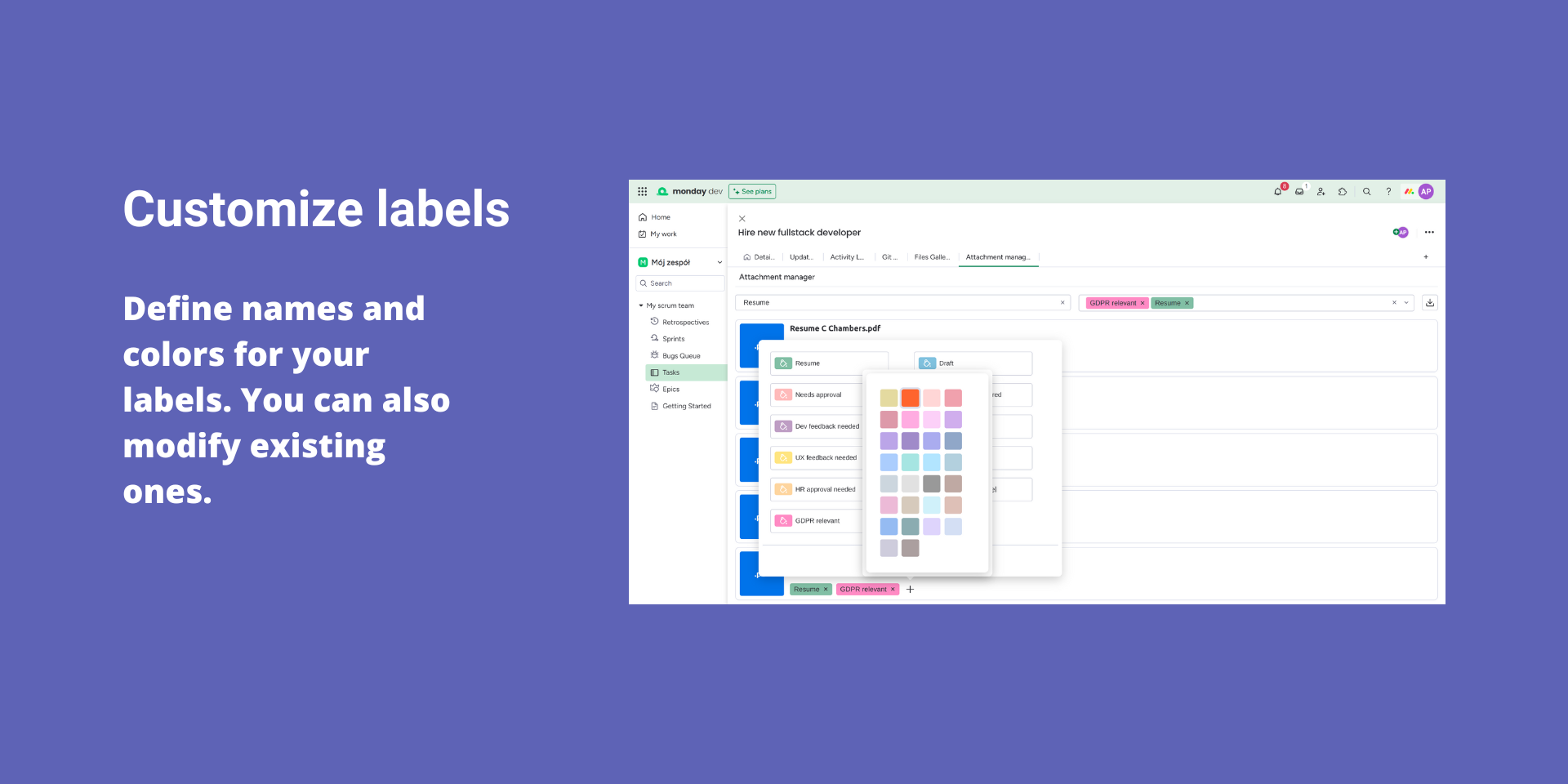 Files Manager gives you more flexibility in your attachment management workflow. Define custom labels and use them to build review processes for attached files. Make it easier to find relevant file among dozens of attachments.